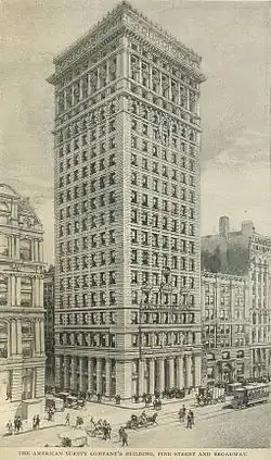 During the late 19th century, life insurance firms were some of the first companies to build high-profile skyscrapers.[33] At the time of the American Surety Building's construction, life insurance companies generally had their own buildings for their offices and branch locations. According to architectural writer Kenneth Gibbs, these buildings allowed each individual company to instill "not only its name but also a favorable impression of its operations" in the general public.[33][34] This had been a trend since 1870,[33][35] with the completion of the former Equitable Life Building just north of the American Surety site.[33][36]