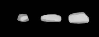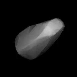 Lightcurve inversion also modeled the body's shape and poles. In 2013, modelling by an international study using photometric data from the US Naval Observatory, the Uppsala Asteroid Photometric Catalogue, the Palomar Transient Factory and the Catalina Sky Survey gave a similar sidereal period of 4.007347 hours and two spin axes of (356.0°, 68.0°) and (153.0°, 78.0°) in ecliptic coordinates (λ, β). The body's very elongated shape had already been indicated by the high brightness variation measured during the photometric observations.[9]