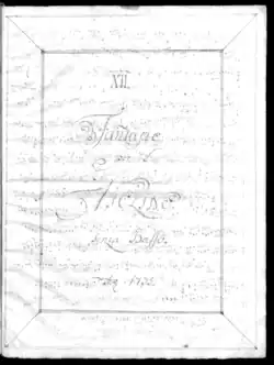 This scheme does not resemble that of the twelve flute fantasies, which progress in a roughly stepwise direction from A major to G minor.[2] However, some overall structure seems to be implied: the first movement of Fantasia 7 subtly references the opening of the first fantasia in the collection, indicating that Telemann possibly conceived this work as two groups of 6 fantasias. He has, indeed, described the collection as "12 fantasias ... of which 6 include fugues and 6 are Galanterien", with "fugues" referencing the contrapuntal style of certain fantasias.[3]