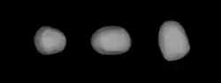 S/2003 (130) 1 is the largest and outermost satellite of Elektra, around 6 km (3.7 mi) in diameter, assuming the same albedo as the primary.[21] It was discovered on 15 August 2003, by a team of astronomers led by W. J. Merline using the Keck II telescope at the Mauna Kea Observatory in Hawaii. The discovery images showed that the satellite had an apparent magnitude difference of 8.5 in the near-infrared K-band. The team confirmed the existence of the satellite after reobserving it with the Keck II telescope on 17 August 2003. The discovery was announced on that same day and the satellite was given the provisional designation S/2003 (130) 1.[23]