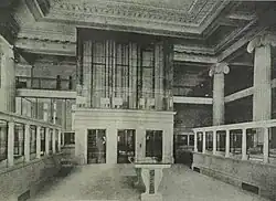At the center of the Wall Street side, a wide staircase led to the first floor. Initially, this was the main entrance to the Bankers Trust offices.[44] The lobby contains a bronze gate with symbols of capitalist enterprises such as metallurgy, shipping, construction, power, agriculture, manufacturing, and mining.[41] Allegorical paintings in the lobby depicted similar motifs.[56] When the building was expanded from 1931 to 1933, the former banking room on the first floor was converted into an officers' seating area, and the floor level was raised to harmonize with the new extension. The double-height second story was divided into two stories, and the third story was created.[15][a] The new addition, with the address 16 Wall Street, contained a T-shaped banking room covering 10,000 square feet (930 m2), with "a forest of squared-off, trunk-like columns clad in Oregon myrtle".[58] The new banking room's coved ceiling was 27 feet (8.2 m) tall.[35][58]