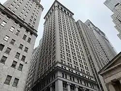 The annex's facade is made of granite at the base and limestone on the upper stories.[30][35] It was designed to defer to the "solid and robust architecture" of the original building.[46] The facade of the annex is arranged in two styles. The Wall Street facade contains setbacks at lower stories, and the window arrangement is aligned with that of the original building.[15] The base consists of four stories. Like the original tower, the first floor is rusticated, and the second through fourth floors contain a colonnade. On upper stories, wide piers divide each bay, and narrow piers divide each window.[43] The piers are ribbed and are designed in a modernistic style.[35] The spandrels between each row of windows are ornamented aluminum panels.[35][43] The combination of piers, spandrels, and windows create a pattern of vertical striping.[47]