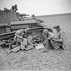 The regiment, which was initially styled the 14th/20th Hussars, was created by the amalgamation of the 14th King's Hussars and the 20th Hussars in 1922.[1] It was re-titled the 14th/20th King's Hussars in December 1936.[1] The regiment, which was based in India at the start of the Second World War, dispatched a cadre of personnel to form the 26th Hussars in February 1941.[1] The remainder of the regiment was deployed to Iraq and Persia later that year to guard the oil fields.[2] It landed in Italy in 1944 and then took part in the capture of Medicina in April 1945.[3][4]