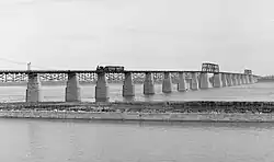 By the 1860s, the Louisville and Nashville Railroad and the Jeffersonville and Indianapolis Railroad both desired a railroad bridge across the river. The United States Congress approved the building of such a bridge on February 17, 1865, stating that it must not interfere with river traffic. As there were no bridges across the Ohio River at Cincinnati or any place west, including Louisville, crossing the river during the winter months during the war years stressed the need for such a bridge. The L&N financed the Louisville Bridge Company to begin building such a bridge, with the work beginning on August 1, 1867. Albert Fink was the architect, who used his Fink truss design for the project. Stone for the bridge's piers came from Bardstown Junction, Kentucky and Utica, Indiana. At the time it was built, it was the longest iron bridge in the United States, with its 27 spans covering a total mile.[4] It was to have a minimum span length of 330 feet (100 m), but the spans were of 352 and 380 feet (107 and 116 m). It was built high enough to allow steamboats to pass underneath on their way through the Falls of the Ohio along the Portland Canal; in fact, the bridge was built higher than was required, raising the cost of the bridge by $150,000.[4][5]