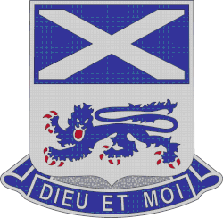 The shield is in the colors of the Infantry. The organization's honorable Civil War service is shown by the saltire, (St. Andrews cross), taken from the Confederate battle flag. The leopard is taken from the arms of Normandy and symbolized the campaigns fought in Northern France. The motto translates to "God and I."