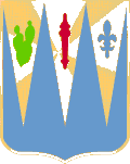 - Shield- Azure, three piles issuant Or, in chief a prickly pear cactus Vert, a sheathed Roman sword paleways, point to base, Gules, and a fleur-de-lis of the first.
