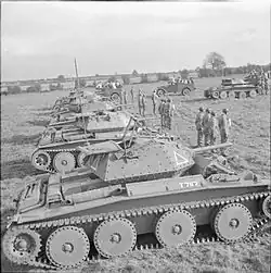 Following the withdrawal, the regiment was assigned to the 3rd Motor Machine Gun Brigade, which was redesignated as the 28th Armoured Brigade and assigned to the 9th Armoured Division.[4] A cadre was detached to form the 23rd Hussars in December 1940.[1] The regiment remained in the United Kingdom until August 1944, when it moved to France to serve as the divisional armoured reconnaissance regiment for the 11th Armoured Division.[4]