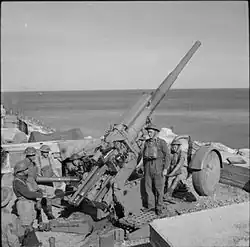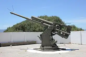 On the outbreak of war in September 1939 there had only been two batteries (bty) (9 and 19 AA Btys) manning the totally inadequate AA defences of Gibraltar, which consisted of four old QF 3-inch heavy AA guns and four new QF 3.7-inch heavy AA guns, split in two-gun sections to give the widest possible coverage, and two of the new Bofors 40mm light AA guns to protect the Royal Navy Dockyard, with the assistance of Royal Navy (RN) 2-pounder pom-pom guns. 10th AA Rgt was formed in December 1939 to command 9 and 19 AA Btys and train the anti-aircraft section of the new Gibraltar Defence Force (GDF), which took over the 3-inch guns. Apart from occasional shots fired at unidentified aircraft penetrating Gibraltar's airspace, there were no attacks on the fortress during the 'Phoney War' period.[1][2][3][4][5]