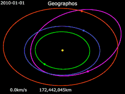 Geographos orbits the Sun at a distance of 0.8–1.7 AU once every 1 years and 5 months (508 days). Its orbit has an eccentricity of 0.34 and an inclination of 13° with respect to the ecliptic.[1] Its orbit is well-determined for the next several hundred years. Due to its high eccentricity, Geographos is also a Mars-crosser asteroid. The body's observation arc begins at Palomar, two weeks prior to its official discovery observation.[3]