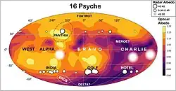 - ^ a b c d e f g h i j k l m n o p q r s t Shepard, Michael K.; De Kleer, Katherine; Cambioni, Saverio; Taylor, Patrick A.; Virkki, Anne K.; Rívera-Valentin, Edgard G.; Rodriguez Sanchez-Vahamonde, Carolina; Fernanda Zambrano-Marin, Luisa; Magri, Christopher; Dunham, David; Moore, John; Camarca, Maria (2021). "Asteroid 16 Psyche: Shape, Features, and Global Map". The Planetary Science Journal. 2 (4): 125. arXiv:2110.03635. Bibcode:2021PSJ.....2..125S. doi:10.3847/PSJ/abfdba. S2CID 235918955.