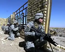 After its activation, the brigade began moving its components from Schweinfurt to Grafenwöhr, Germany, as part of the Grow the Army plan.[40] Simultaneously, the brigade converted to a modular structure to become a Brigade Combat Team upon completion.[41] In May 2008, the brigade was alerted that it would be returning to Iraq in the fall of that year.[42][43] The deployment was set to last 12 months,[42] and was set to start after the unit's 12-month out-of-action cycle ended in November 2008.[44][45] This would be the brigade's third tour to Iraq,[46] as it completed a tour of duty in Iraq shortly before being redesignated from the 2nd Brigade, 1st Infantry Division. The brigade began training for its deployment to the country as soon as it received orders for deployment. German military officers trained with the brigade during this preparation.[47] The soldiers of the brigade were part of a 40,000-soldier troop rotation into Iraq and Afghanistan, intended to maintain previous troop levels in both countries until late 2009.[48] In fall of 2008, the brigade completed its transition to a brigade combat team, and was redesignated as the 172nd Infantry Brigade Combat Team.[49]