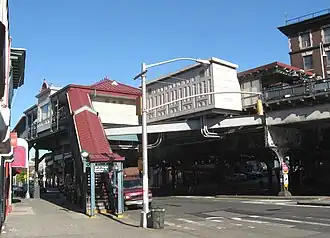 The city government took over the IRT's operations on June 12, 1940.[11][12] The Bergen Avenue cutoff, which allowed Third Avenue trains to access the White Plains Road Line, was abandoned on November 5, 1946, as part of the gradual curtailment of elevated service on the IRT Third Avenue Line.[4] On June 13, 1949, the platform extensions at this station, as well as those on other White Plains Road Line stations between Jackson Avenue and 177th Street, opened. The platforms were lengthened to 514 feet (157 m) to allow full ten-car express trains to open their doors. Previously, the stations could only accommodate six-car local trains.[13]