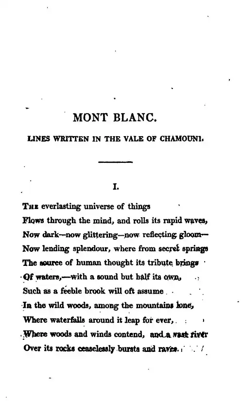 - "Mont Blanc", published in History of a Six Weeks' Tour through a part of France, Switzerland, Germany, and Holland, a book written with his wife, Mary, who wrote most of the prose (Percy Shelley wrote the poem)