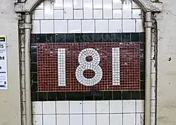 The outer walls of the platform level consist of tiled alcoves, slightly recessed within concrete arches. The station's tiles are colored maroon.[5]: 4 This was part of a color-coded tile system used throughout the IND.[58] The tile colors were designed to facilitate navigation for travelers going away from Lower Manhattan. As such, the maroon tiles used at the 181st Street station are also used at 168th Street, the first express station to the south, as well as at other stations on the Eighth Avenue Line north of 168th Street.[59][60] Small maroon, black, and white mosaics with the number "181" are located within some of the alcoves. Within the alcoves that do not contain the "181" mosaic, there are black tiles with white numerals reading "181". The uptown platform has black-and-white signs for Yeshiva University.[5]: 4