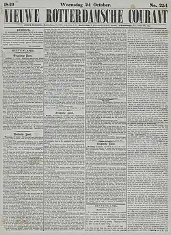 In the meantime, Lightenvelt and Donker Curtius had started looking for an alternative and ended up with the moderately liberal Speaker of the House of Representatives Jan Karel van Goltstein. On 22 October, Van Goltstein agreed to act as formateur. Two days later, however, an anonymous letter appeared in the Nieuwe Rotterdamsche Courant (NRC), describing the formation process, including the 'trap' that asked Thorbecke for a complete government program. The piece was probably composed by Thorbecke and written by Gijsbertus Martinus van der Linden.[9]