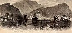 Approximately 100 homes were destroyed on Virgin Gorda and 26 others on Jost Van Dyke.[7][8] The hurricane drove ashore or otherwise wrecked 80 ships on Saint Thomas,[9] including the RMS Rhone where a barometric pressure reading of 965 mbar (28.5 inHg) and winds of 74 mph (119 km/h) occurred.[4] One ship that capsized, the steamer Columbian, held approximately $1 million to $2 million worth of cargo, while six of its occupants were lost. On land, the hurricane rendered thousands of people homeless.[10] A correspondent to the St. Croix Avis described Charlotte Amalie as "frightful to look at", with "scarcely one building, whether old or new, left uncovered and many ... reduced to atoms."[7] Roughly 600 people drowned throughout Saint Thomas.[4]