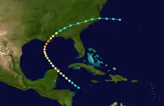 Despite the prior hurricane intensity, only after October 1 – when rain from the storm was already moving onshore the northern coast of the Gulf of Mexico – did weather observations clearly indicate that a hurricane existed.[3] The Weather Bureau had been unaware of the storm, predicting southeasterly winds and fair conditions following "light showers" on the Gulf coast for the night of October 1.[6] In reviewing and revising the tracks of historical storms maintained by the National Climatic Center, meteorologist José Fernández-Partagás found that the storm's listed positions prior to October 1 could not be reviewed due to a "lack of suitable information" and made no changes to the preexisting track in the database.[7][8] A new analysis conducted by meteorologist Michael Chenoweth of Atlantic tropical cyclones in the late 19th century, published in the Journal of Climate in 2014, lists the storm as having originated in the Bay of Campeche on September 27, after which the storm tracked northeast and bypassed the Yucatan Peninsula before entering the north-central Gulf of Mexico where the presence of the storm was first clearly resolved.[3][9]