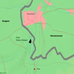 On the official Belgian withdrawal from the Western Alliance, the Belgians refused to engage in any official staff meetings with French or British military staff for fear of compromising their neutrality. The Belgians did not regard a German invasion as inevitable and were determined that if an invasion did take place it would be effectively resisted by new fortifications such as Eben Emael.[14] The Belgians had taken measures to reconstruct their defences along their border with Germany upon Adolf Hitler's rise to power in January 1933. The Belgian government had watched with increasing alarm the German withdrawal from the League of Nations, its repudiation of the Treaty of Versailles and its violation of the Locarno Treaties.[15] The government modernised fortifications at Namur and Liège, and established new lines of defence along the Zuid-Willemsvaart (the Maastricht–'s-Hertogenbosch canal), joining the Meuse, the Scheldt and the Albert Canal lines.[15] Protection of the eastern frontier, based mainly on obstructing a number of roads by trees, landslides and destroying key bridges, was entrusted to new formations (frontier cyclist units and the newly formed Chasseurs Ardennais).[16] By 1935, the Belgian defences were completed.[16] Even so, it was felt that the defences were no longer adequate. A significant mobile reserve was needed to guard the rear areas, without which the protection against a surprise assault by German forces would not be sufficient.[16] Significant manpower reserves would also be needed, but the public rejected a bill requiring longer military service and refresher training for fears that it would increase Belgium's military commitments, perhaps in conflicts far from home.[17]