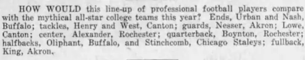 2. ^ "1921 APFA All-Pros". pro-football-reference.com. Sports Reference LLC. Retrieved July 24, 2014.