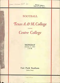 Centre came into the game undefeated, outscoring its opponents by a margin of 314 to 6.[2] It also upset Harvard in the regular season in what was later deemed one of the greatest upsets in college football history.[3] A&M finished its regular season 5–1–2 and captured a Southwest Conference title.[4]