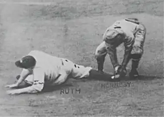 ![]() Rogers Hornsby tags out Babe Ruth who is caught attempting to steal second base, ending the 1926 World Series. | ||||||||||