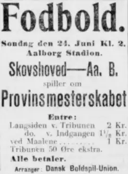- ^ a b c "Fodbold. Søndag den 24. Juni Kl. 2. Aalborg Stadion. Skovshoved—Aa. B. spiller om Provinsmesterskabet" (in Danish). No. 162. Aargang, Nr. 168. Aalborg Stiftstidende. 22 June 1928. p. 10.