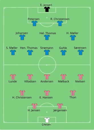 As a consequence of the strong winds IK Viking Rønne was able to compete on equal terms against the much stronger Skovshoved IF-players, which was emphasized during the second half.[10][22][21] After a few minutes, SIF scored the first goal, greatly assisted by IK Viking's Niels Mortensen, whereafter they progressed in gaining the upper hand for the remaining part of the match, and were quite dominant in the last 15 minutes — a local newspaper, based on Bornholm, referred this to insufficient training on the Rønne-players' part.[10][22][20] The Rønne-team's Charles Olsen and Karl Mortensen had some great opportunities for scoring goals, but both failed to accomplish the objective.[20] During the second half, the home team's centerforward, Svend Strømann, scored four goals — between 2 and 3 goals using his head — while the team's right winger Ernst Sørensen and the team captain, Helmuth Thomas, each scored one goal — contributing to Skovshoved IF's victory of 6–1.[10] According to the local Bornholm newspaper, players on both teams hailed the IK Viking goalkeeper, Vilhelm Reker, as the best player on the field.[10]