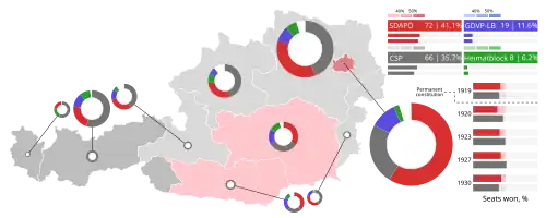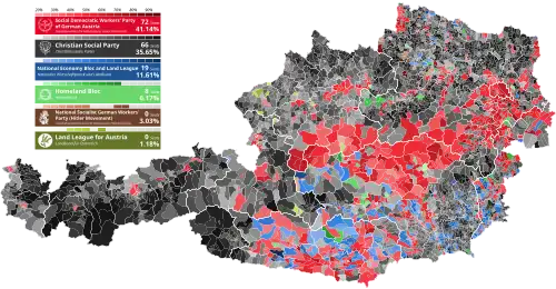 | | First party | Second party | | | | | | Leader | Karl Seitz | Karl Vaugoin | | Party | SPÖ | CS | | Last election | 42.28%, 71 seats | 48.24%, 85 (EL) | | Seats won | 72 | 66 | | Seat change | 1 | 19 | | Popular vote | 1,517,146 | 1,314,956 | | Percentage | 41.14% | 35.65% | | Swing | 1.14 pp | 12.41 pp | | | | Third party | Fourth party | | | | | | Leader | Franz Dinghofer | Ernst Rüdiger Starhemberg | | Party | GDVP–LB | HB | | Last election | 6.32%, 9 (LB) | – | | Seats won | 19 | 8 | | Seat change | 10 | New | | Popular vote | 428,255 | 227,401 | | Percentage | 11.61% | 6.17% | | Swing | 5.28 pp | New | |