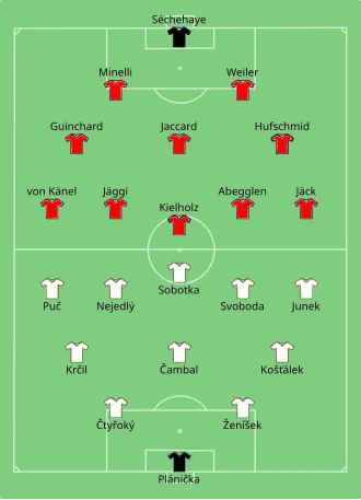 In a well-balanced game, Switzerland took the lead with Kielholz thanks to a counter-attacking play. Czechoslovakia equalized soon after with František Svoboda, who turned a chance created by Jiří Sobotka into a goal. In the second half, although Switzerland dominated the ball possession, it was Czechoslovakia scoring twice and holding on for the victory.[2]