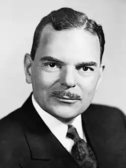 Meanwhile, Dewey set to work expanding and strengthening the New York Republican Party and continued in his role as Manhattan District Attorney.[4] His conviction of Tammany Hall leader James Joseph Hines won him further national praise, especially from Republicans eager to tie Hines to the Roosevelt administration. A Gallup poll following the verdict showed him with a majority of the Republican vote (well ahead of Taft and Senator Arthur Vandenberg) and leading President Roosevelt, 58–42.[5] In December, he delivered an anti-New Deal speech to a capacity crowd in Minneapolis.[6]