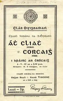 The 1942 All-Ireland Senior Hurling Championship Final was the 55th All-Ireland Final and the culmination of the 1942 All-Ireland Senior Hurling Championship, an inter-county hurling tournament for the top teams in Ireland. The match was held at Croke Park, Dublin, on 6 September 1942, between Cork and Dublin. The Leinster champions lost to their Munster opponents on a score line of 2–14 to 3–4.[1]