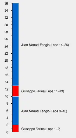On lap 10 Fangio lost the lead due to a broken visor strap that forced him into the pit. However, he quickly recovered and retook the lead. Farina had to retire with engine failure on lap 14, which left Fangio quite unchallenged with Hawthorn over a minute behind in second.
