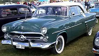 1953 was Ford's 50th anniversary.[3] The big news for 1953 was the availability of power-assisted brakes and steering, which had previously been limited to the Mercury and Lincoln lines. The center grill bullet lost its ring and was now flanked by vertical black stripes, while the corner markers were plain rectangular lights rather than the circular "intakes". All 1953 Fords featured commemorative steering wheels marking the company's 50th anniversary. Mechanical changes included two-inch wider tread, and a k-bar frame with five cross-members.[6] William Clay Ford paced the Indianapolis 500 in a Sunliner convertible with a dummy Continental tire kit (Coronado kit).[3] This was also the last year for real wood trim on the Country Squire wagon. Toward the end of the year, Ford added "Master-Guide" power steering as an option on cars with V8s. Full instrumentation was still used.[7] An unusual service provided by Ford was that the radio preset buttons would already be set to local stations by the dealer.[8] The heater was $74.[9][3]