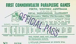 The First Commonwealth Paraplegic Games were held in Perth, Western Australia, from 10 to 17 November 1962. These Games preceded the 1962 British Empire and Commonwealth Games which were held in Perth from 22 November to 1 December of that year.[1] The Commonwealth Paraplegic Games were conceived by George Bedbrook after Perth won the right to host the Commonwealth Games. Great support was received from Royal Perth Hospital, a leading spinal rehabilitation centre in Australia.