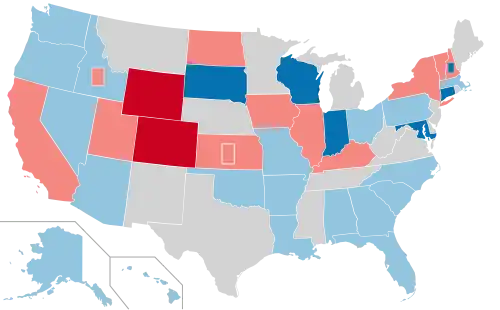 | D61 S.C. Re-elected | D62 Wash. Re-elected | D63 Conn. Gain | D64 Ind. Gain | D65 Md. Gain | D66 N.H. (sp) Gain | D67 S.D. Gain[b] | D68 Wisc. Gain | R32 Wyo. (sp) Gain[b] | R31 Colo. Gain |