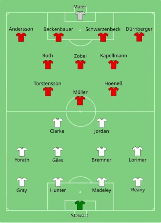 After a match interruption Roth finished off a counter-attack in the 71st minute by taking the lead for Bayern after a short pass from Conny Torstensson. 10 minutes later another counter led to a second goal for Bayern through Gerd Müller after a cross from the right side by Jupp Kapellmann.