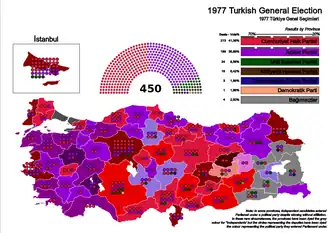 General elections were held in Turkey on 5 June 1977. Elections took place in the middle of a political race between the right-wing Justice Party (AP) and the left-wing Republican People's Party (CHP). With the charismatic leadership of Bülent Ecevit, the CHP managed to beat one of the symbolic figures of conservative politics in Turkey, Süleyman Demirel. Voter turnout was 72%.[1]
