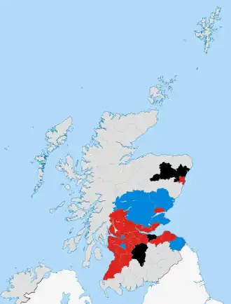 Labour had a very good electoral performance, more than regaining the ground they had lost at the 1977 elections. They gained 18 councils: 3 from the Scottish National Party, one from Liberals and 14 from no overall control. Notable gains were the cities of Aberdeen, Dundee and Glasgow.[3] The Conservatives suffered the loss of Edinburgh but held another six councils. The SNP vote collapsed and they lost control of the three councils they controlled. In a number of councils all of the party's sitting councillors were defeated, most notably in Glasgow where they lost all 16 seats they held. The Liberal Party lost the only council they controlled.[3]
