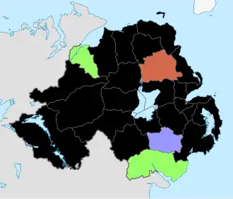 ![]() Colours denote the party with the most first preference votes in each District Electoral Area (darker colours indicate a majority of first preference votes). | |||||||||||||||||||||||||||||||||||||||||||||||||||||||||||||||||||||||||||||