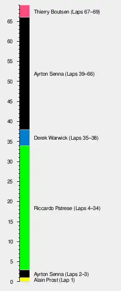 Senna passed Alliot for third, behind the two Williams cars of Patrese and Boutsen. This order continued until lap 11, with Warwick fifth, ahead of Larini, Arnoux, Danner, Capelli and Sala. Next were the two Dallaras of Caffi and de Cesaris, followed by Palmer, Piquet and Gugelmin. The last two runners, Moreno and Johansson, had already been lapped.