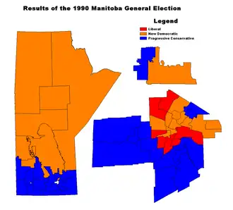 The 1990 Manitoba general election was held on September 11, 1990 to elect Members of the Legislative Assembly (MLAs) of the Province of Manitoba, Canada. It was won by the Progressive Conservative (PC) Party, which took 30 out of 57 seats. The New Democratic Party finished second with 20, while the Liberal Party fell from 21 to 7.