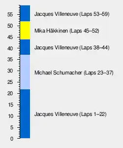 Two previous leaders retired from the race due to mechanical failures. Michael Schumacher led by over 40 seconds before a wheel bearing failure caused retirement. Mika Häkkinen seemed set for his first win but his engine blew while he was holding off Villeneuve, having made one stop to the Canadian's two. Further back, Alexander Wurz scored his first podium finish in his third Grand Prix, also briefly leading the race during the pitstops. David Coulthard ran 3rd early on, but faded with braking problems. Schumacher's teammate Eddie Irvine was close behind Villeneuve when both made their second stop, but his car failed as he exited the pits. Defending champion Damon Hill finally scored his first points for Arrows after a late retirement for Shinji Nakano.