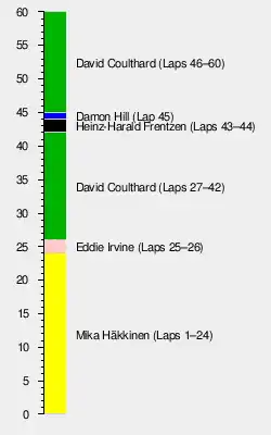 This was McLaren team's first British Grand Prix victory since 1989. The podiums of Coulthard and Irvine (for 1st and 2nd) also marked the last time two drivers racing under a British flag would stand together on the podium at their home event at until the 2023 British Grand Prix where Lando Norris and Lewis Hamilton finished second and third.