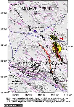 This strike-slip earthquake occurred in a remote part of the Mojave Desert, 47 miles (76 km) east-southeast of Barstow, California, inside the Twentynine Palms Marine Corps Base. Strike-slip faults are fractures where the blocks have mostly moved horizontally. If the block under the right foot of the observer straddling the fault moves towards the observer, the slip style is termed right lateral; if the block under the observer's left foot moves towards the observer, the fault is termed left lateral.[12] This right-lateral strike-slip quake involved rupturing the Lavic Lake fault and the Bullion Fault.[11]