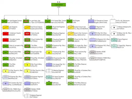 On 21 July 2014, the division was renamed the 1st (United Kingdom) Division. The redesignation, part of the Army 2020 changes, was the start of the division's restructure from an armoured formation to one that consisted of light infantry, and the start of its role in the Adaptable Force.[94][95] On 2 June 2015, the divisional headquarters moved from Germany to Imphal Barracks, York.[96] Upon its reorganisation, the division consisted of the 4th Infantry Brigade—previously the 4th Mechanized and the 15th (North East) Brigades—and was based at Catterick Garrison); the 7th infantry Brigade—the previous 7th Armoured Brigade's headquarters merged with the 49th (Eastern) Brigade—and was based at Chetwynd Barracks, Chilwell); the 11th Infantry Brigade at Aldershot Garrison; the 38th (Irish) Brigade at Thiepval Barracks, Lisburn; the 42nd Infantry Brigade at Fulwood Barracks, Preston; the 51st Infantry Brigade at Redford Barracks, Edinburgh; the 102nd Logistic Brigade at Prince William of Gloucester Barracks, Grantham; and the 160th Infantry Brigade at The Barracks, Brecon.[94]