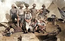 The battalion landed in South Africa on 3 May, where the companies were posted to separate formations during the guerrilla war phase of the campaign.[8][11] For example, at the end of July the 72nd and 79th Companies of 'The Roughs' joined Col Bryan Mahon's force at Pretoria alongside the 20th (Fife and Forfar Light Horse) Company and a composite squadron formed from the depleted 7th Battalion, IY (25th (West Somerset), 26th (Dorset), 27th (Devon), 48th (North Somerset) and 69th (Sussex) Companies) and saw action at Olifant's Nek in August during the pursuit of Christiaan de Wet. 'The Roughs' were popular among their fellow yeomen because of the large quantities of food and comforts they received from family and friends in the city. In September 1900 72nd Company was serving alongside the composite squadron in a column under Maj-Gen R.A.P. Clements pursuing Koos de la Rey. In October the company was ordered back to Pretoria.[12][13][14][15]