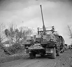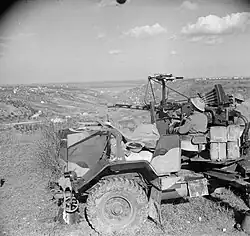 The Torch landings began on 8 November and the build-up of forces continued over succeeding weeks as V Corps pushed eastwards towards Tunis. It was halted short of the city by Axis forces, and there was a pause while the build-up continued. By mid-January the 11th CoLY LAA Rgt had arrived and moved up to defend V Corps' assets in the forward area, where German and Italian divebombing and 'tank-busting' attacks were frequent. However the concentration of British LAA guns drove the enemy aircraft to bomb from higher altitude. AA ammunition expenditure was high, and supply was erratic over the poor roads of Tunisia.[135][136] V Corps and the air forces continued their build-up, and by mid-March one of 11th (CoLY) LAA Rgt's batteries had been detached under 22 AA Bde as part of the defences for Souk-el-Khemis Airfield where the first Spitfires had been deployed and begun to win air superiority.[137][138] First Army renewed its offensive at the end of March with massive air support and by the time of the Fall of Tunis in May 1943, the whole regiment was assigned to airfield protection under 22 AA Bde.[139][140]