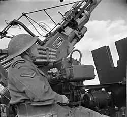 The TA's AA units were mobilised on 23 September 1938 during the Munich Crisis, with units manning their emergency positions within 24 hours, even though many did not yet have their full complement of men or equipment. The emergency lasted three weeks, and they were stood down on 13 October.[85] In February 1939 the existing AA defences came under the control of a new Anti-Aircraft Command. In June, as the international situation worsened, a partial mobilisation of the TA was begun in a process known as 'couverture', whereby each AA unit did a month's tour of duty in rotation to man selected AA sites. On 24 August, ahead of the declaration of war, Anti-Aircraft Command was fully mobilised at its war stations, with LAA units distributed to defend Vulnerable Points (VPs) such as factories and airfields.[86]