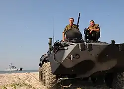 On the morning of March 24, Russian troops, supported by two Mil Mi-24 helicopters, stormed part of the Feodosian marines. Ukrainian marines engaged in hand-to-hand combat, but were captured.[9] Battalion commander Dmytro Delyatskyi and deputy personnel commander Rostislav Lomtev were taken by helicopter to an unknown destination by the Russian military.[10] On the same day, the Deputy Chief of the Main Command Center of the Armed Forces of Ukraine, Major General Oleksandr Rozmaznin, announced that a marine brigade of Ukraine would be created on the basis of the Feodosia 1st Marine Battalion.[11]