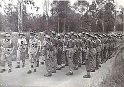 A period of leave followed, after which the regiment was reconstituted at Wondecla, returning to the control of the 1st Australian Corps.[8] There were limited combat opportunities for Australian forces around this time, as US forces had taken over as the main combat force in the Pacific.[9] The reduced artillery scale of the jungle converted divisions also limited the opportunities for artillery regiments.[10] The regiment was not deployed to Borneo when 1st Corps deployed and it was subsequently reassigned to the 11th Division in April 1945. A further change of assignment came in July when it was transferred to the 5th Division, at which time the regiment moved to Kairi, where it remained until war's end. The regiment was disbanded in late 1945.[11] A total of 1,458 men served in the regiment throughout the war. One member was decorated, Major A.R. Blair, who received a Mention in Despatches for service in Merauke. Three members of the regiment were killed in action while serving with other units.[12]
